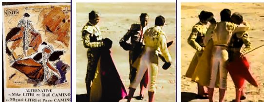 Como acontecimiento sin antecedentes ni sucedáneos, la corrida del 26 de septiembre de 1987 en el anfiteatro romano de Nimes no tiene desperdicio. La idea era digna de Simón Casas en su etapa de mayor extravagancia creativa y consistía en algo tan insólito como esto: hacer que don Miguel Báez Espuny “Litri” y don Francisco Camino Sánchez, dos ilustres maestros en retiro desde hacía bastantes años, se volvieran a enfundar en el terno de luces para apadrinar las alternativas de sus hijos Mike “Litri” y Rafi Camino –así los anunció el cartel de la corrida–, como culminación de una etapa novilleril en pareja escrupulosamente cuidada, antes que nadie, por sus propios y ya mencionados progenitores; los respaldaba una escalada de éxitos como para colmar de atractivos la cita, pues no sólo de trataba de revivir fugazmente al toreo a dos veteranos de alcurnia, sino de asistir el trascendental cambio de estatus de dos probables futuros ases.