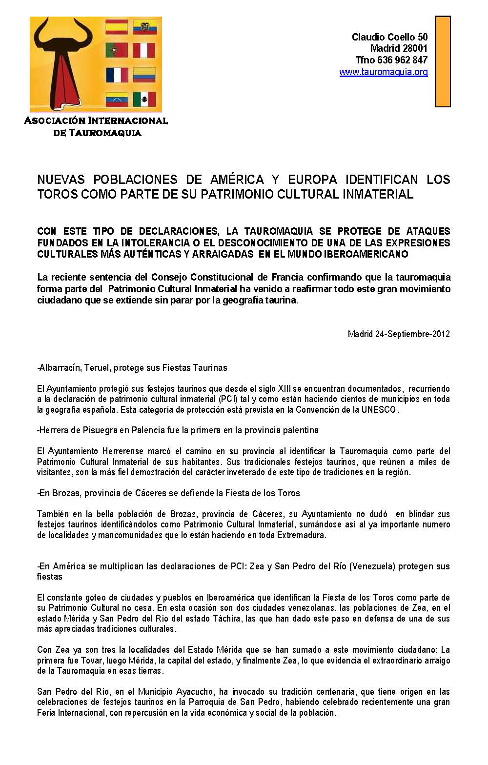 Nuevas declaraciones en América y Europa que identifican sus celebraciones taurinas como parte de su patrimonio cultural inmaterial