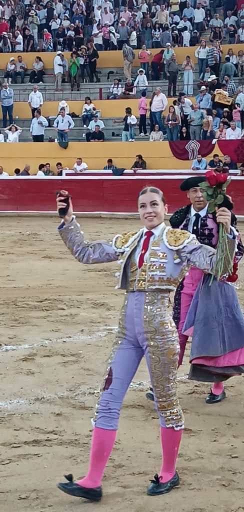 Su primer novillo, «Consentido», de Rancho Grande, fue lidiado con una clase y un poderío inusuales para una debutante. Casado se hizo dueña de la situación desde el primer momento, recibiendo al astado con un dominio capotero que incluyó faroles y una media verónica de hinojos que levantó una ovación clamorosa. Con la muleta, mostró una técnica impecable y un arte desbordante, toreando con soltura al natural y dejando un variado repertorio de pases: dosantinas, afarolados y manoletinas, ejecutados con gran garbo y fluidez. Una media estocada fue suficiente para que el novillo rodara, y la novillera se ganara las dos orejas, el primer gran premio de su tarde.