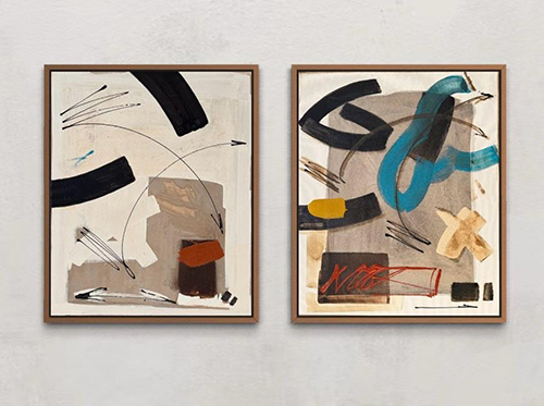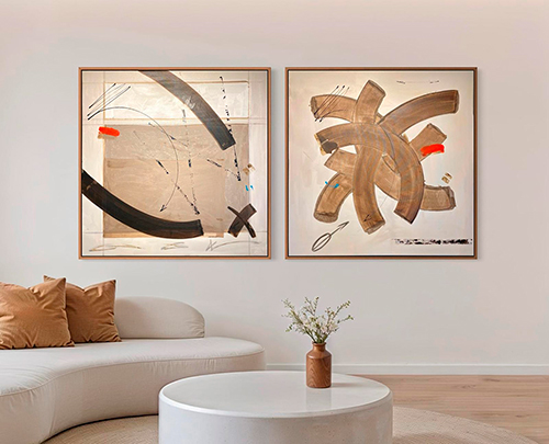 En esta ocasión, presenta dos líneas de trabajo que dialogan entre sí. La primera se mueve en una paleta reducida y tonalidades neutras, apoyándose en fondos café que generan una atmósfera introspectiva y pausada. Son piezas que invitan a detenerse y escuchar el silencio que hay detrás del gesto. La segunda línea, en cambio, estalla en color: una gama cromática amplia, vibrante, con la energía característica del artista e incluso incursiones en tonos flúor. Aquí la pintura se vuelve impulso, movimiento y vitalidad pura.