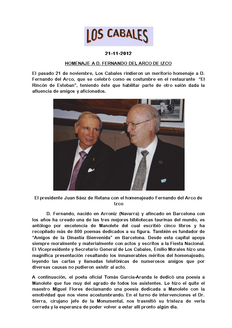 Peña Los Cabales rindió homenaje a Don Fernando del Arco de Izco