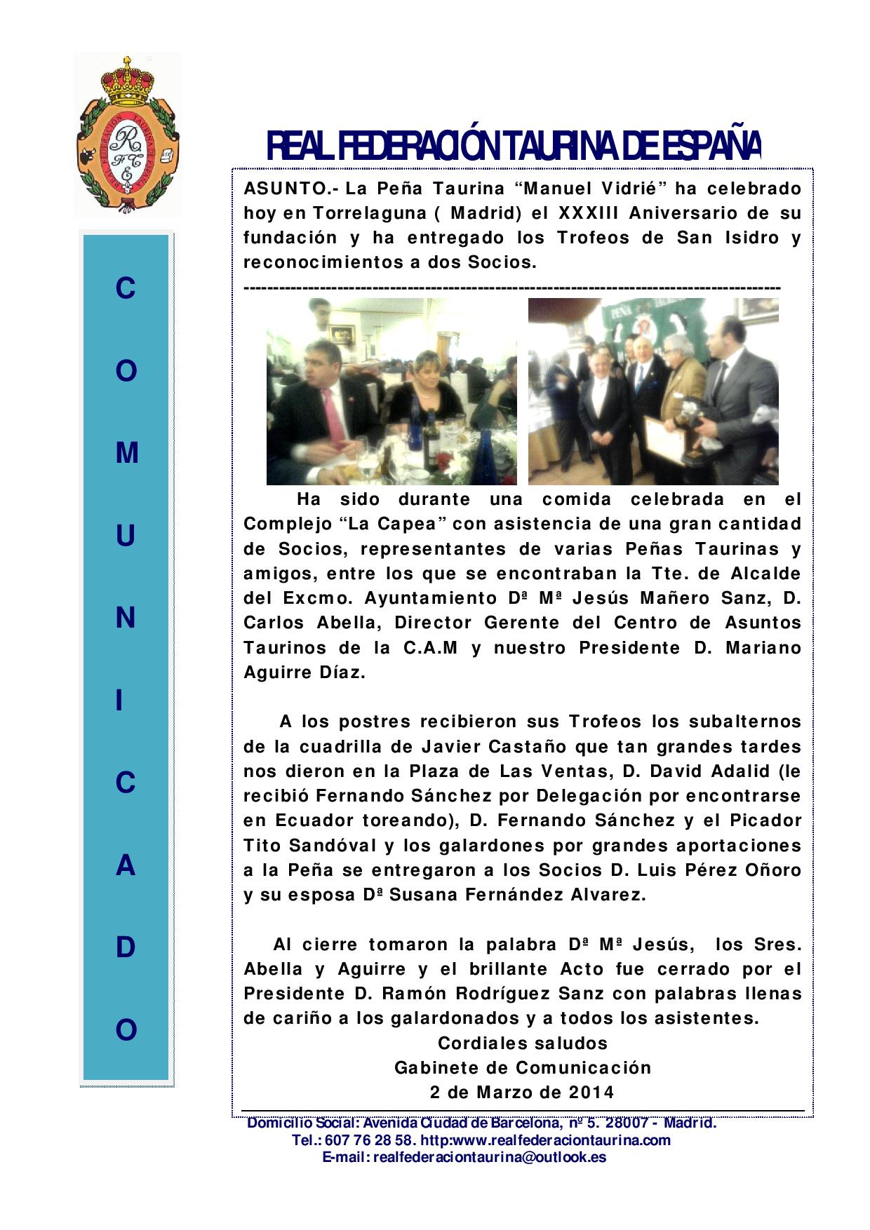 Peña Taurina Manuel Vidrié celebró el XXXIII Aniversario de su fundación