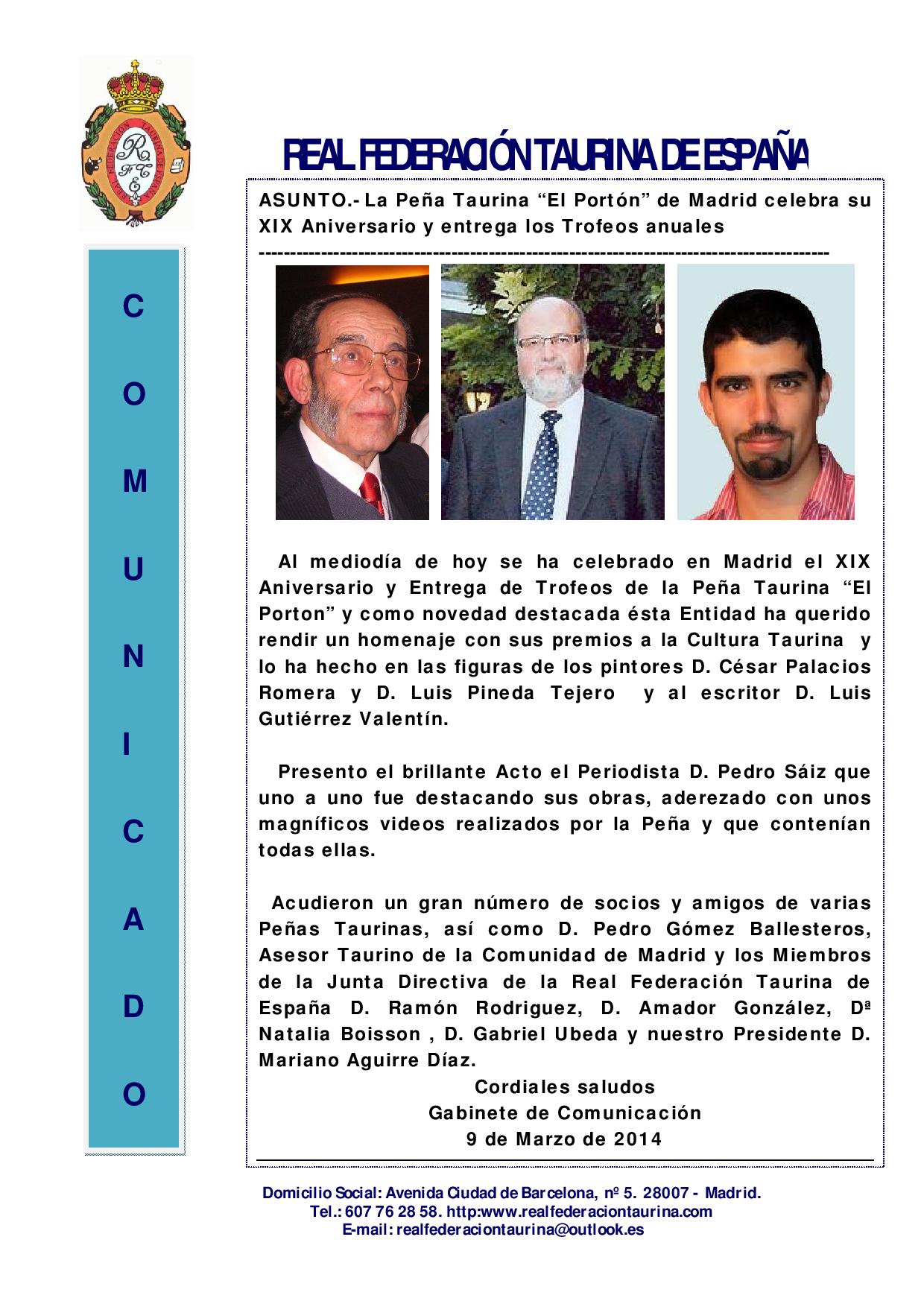 Peña Taurina El Portón de Madrid celebra su XIX Aniversario y entrega los Trofeos anuales