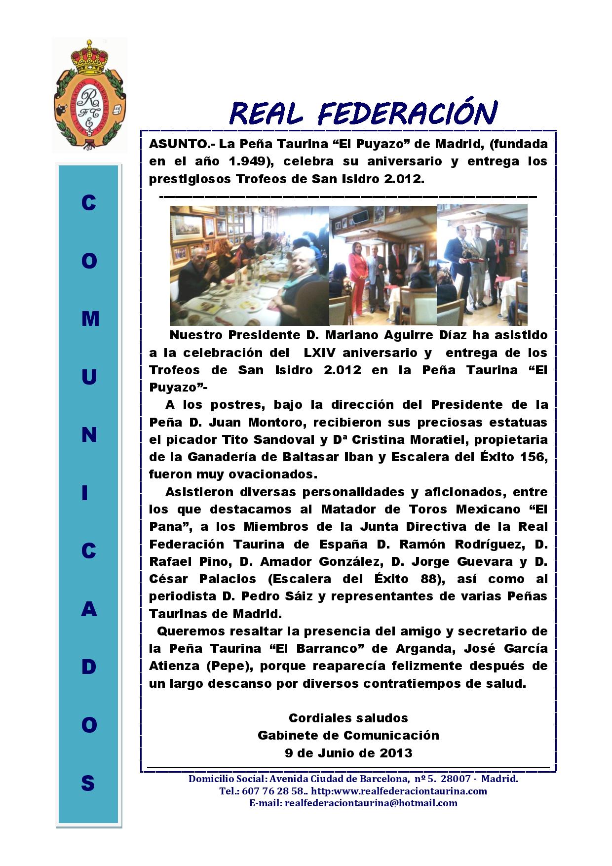 Peña Taurina El Puyazo de Madrid celebra su aniversario y entrega Trofeos de San Isidro 2.012