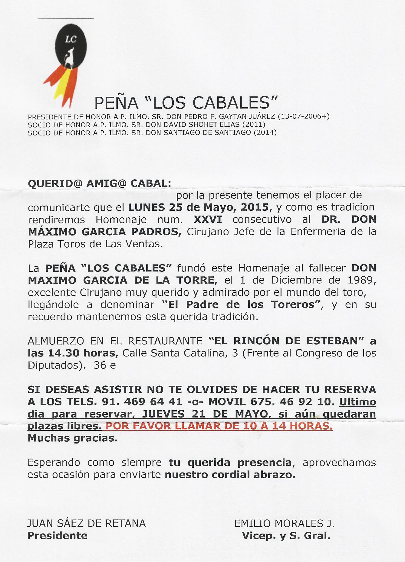 Peña Taurina `Los Cabales´ rendirá homenaje nº XXVI al Dr. Máximo García Padrós (Escalera del Éxito nº 55)