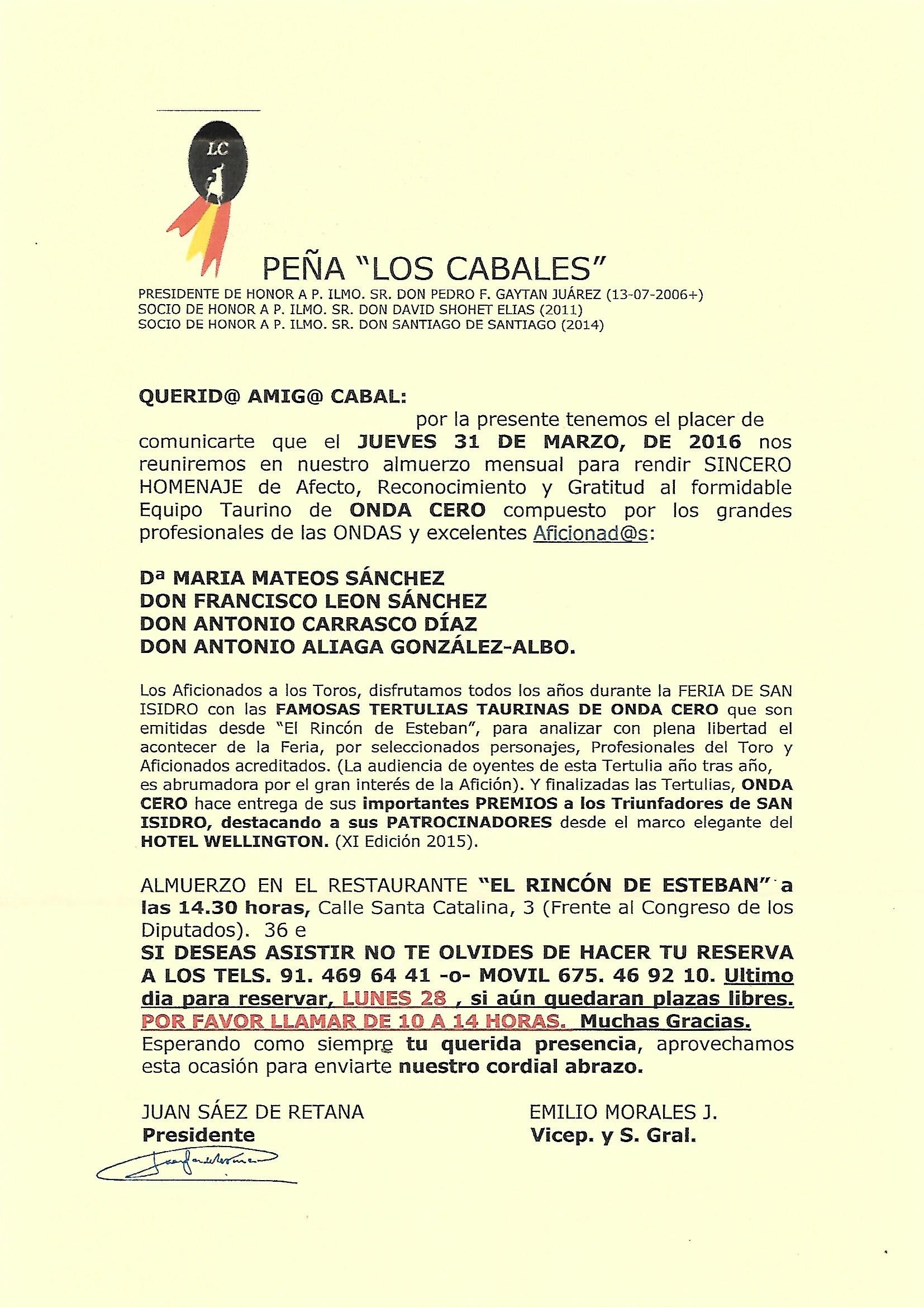 Peña Taurina `Los Cabales´ rinde homenaje al Equipo Taurino de Onda Cero