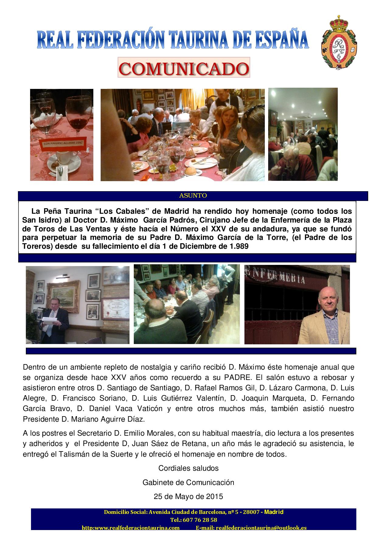 Peña Taurina Los Cabales rindió homenaje a D. Máximo García Padrós (Escalera del Éxito nº 55)
