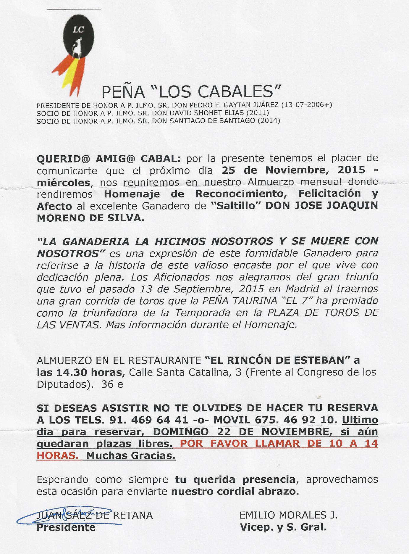 Peña Taurina `Los Cabales´rinde homenaje al Ganadero Don José Joaquín Moreno de Silva