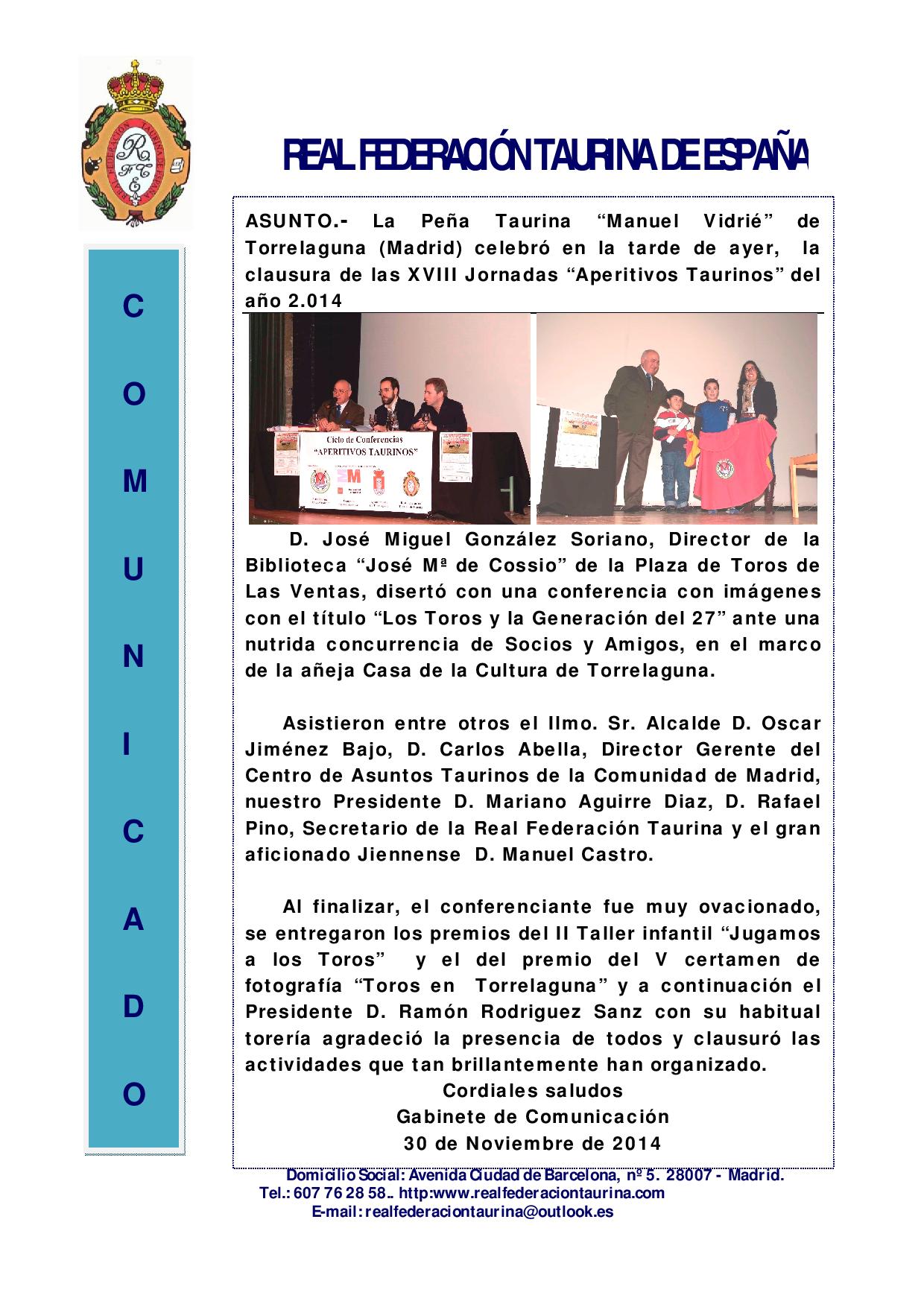 Peña Taurina `Manuel Vidrié´ celebró la clausura de las XVIII Jornadas `Aperitivos Taurinos´ 2014