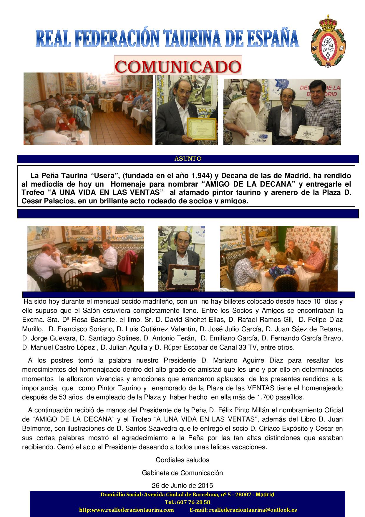 Peña Taurina Usera de Madrid ha nombrado Amigo de la Decana a Don César Palacios. Escalera del Éxito 88