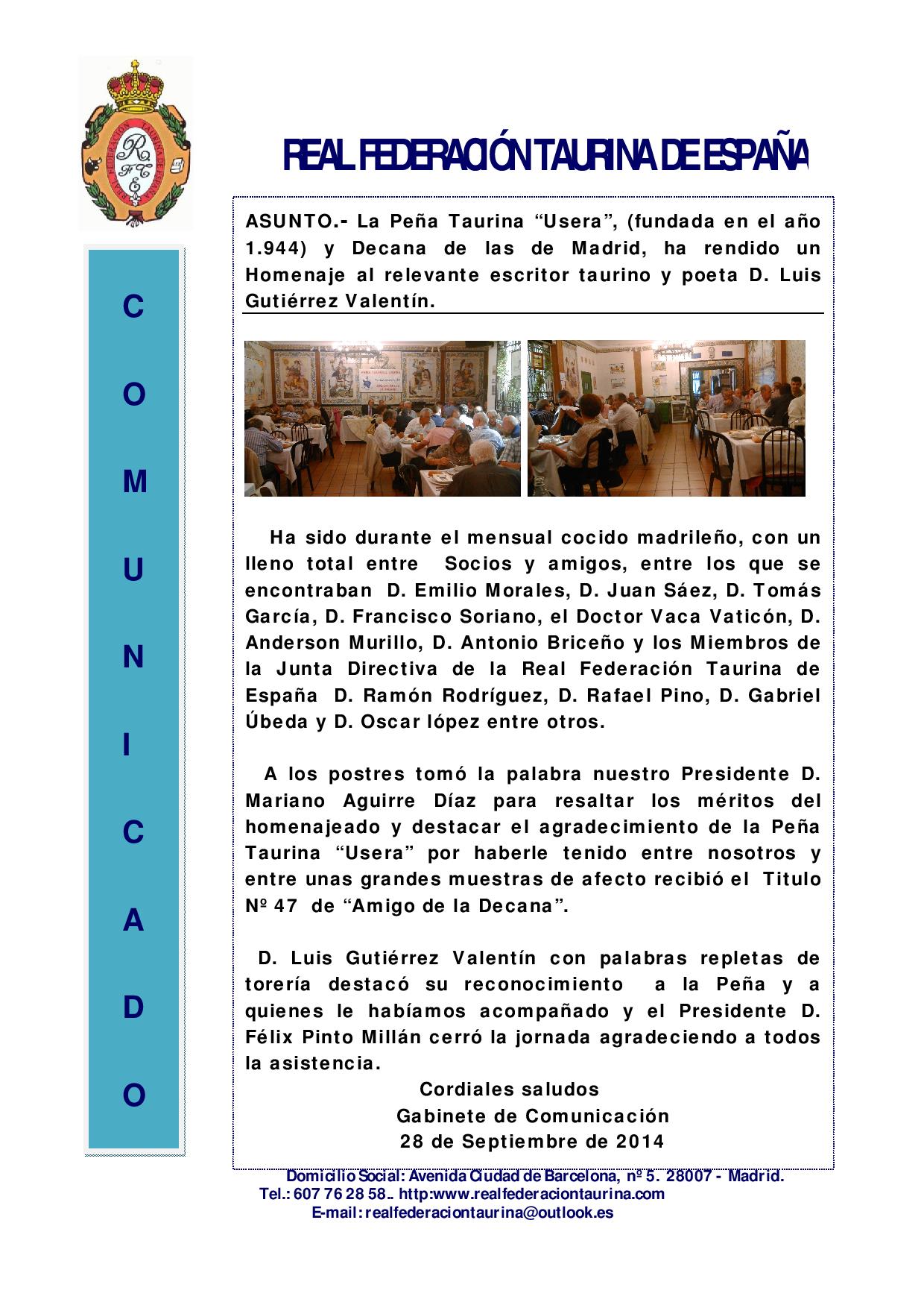 Peña Taurina Usera, Decana de las de Madrid, ha rendido un Homenaje al relevante escritor taurino y poeta Don Luis Gutiérrez Valentín