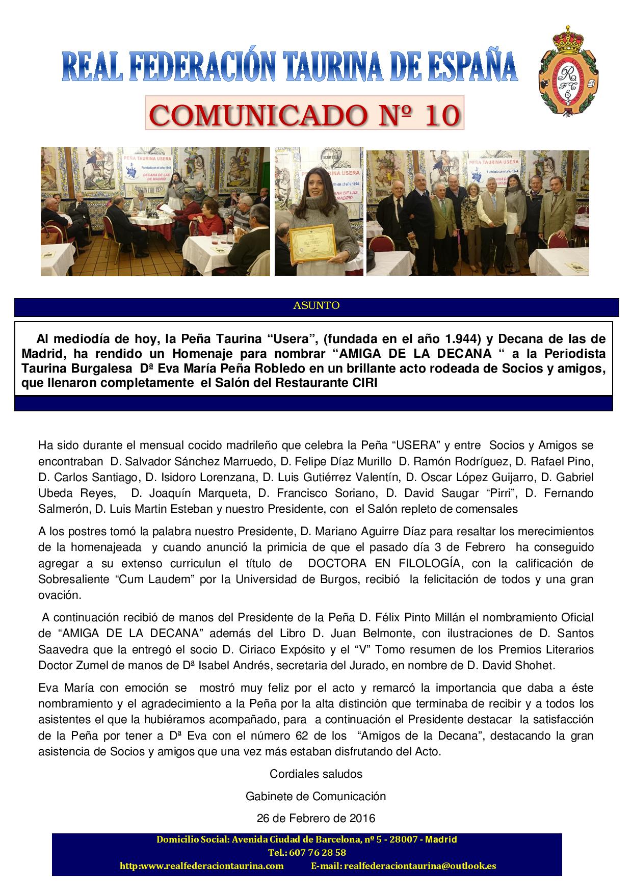 Peña Taurina `Usera´, Decana de las de Madrid, nombró `AMIGA DE LA DECANA´ a la Periodista Taurina Burgalesa Dª Eva María Peña Robledo