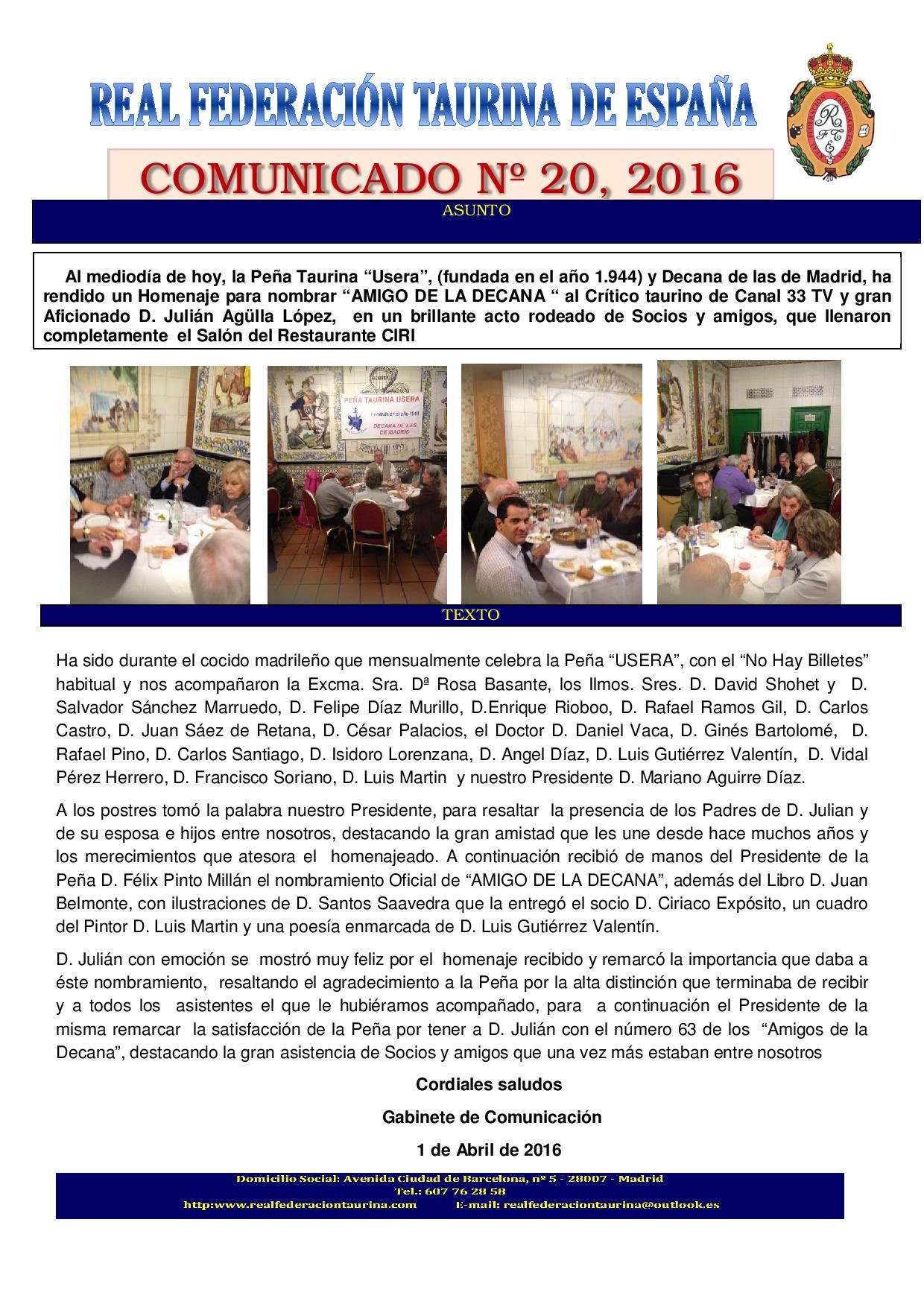 Peña Taurina `Usera´, Decana de las de Madrid, nombró `AMIGO DE LA DECANA´ a Don Julián Agulla López