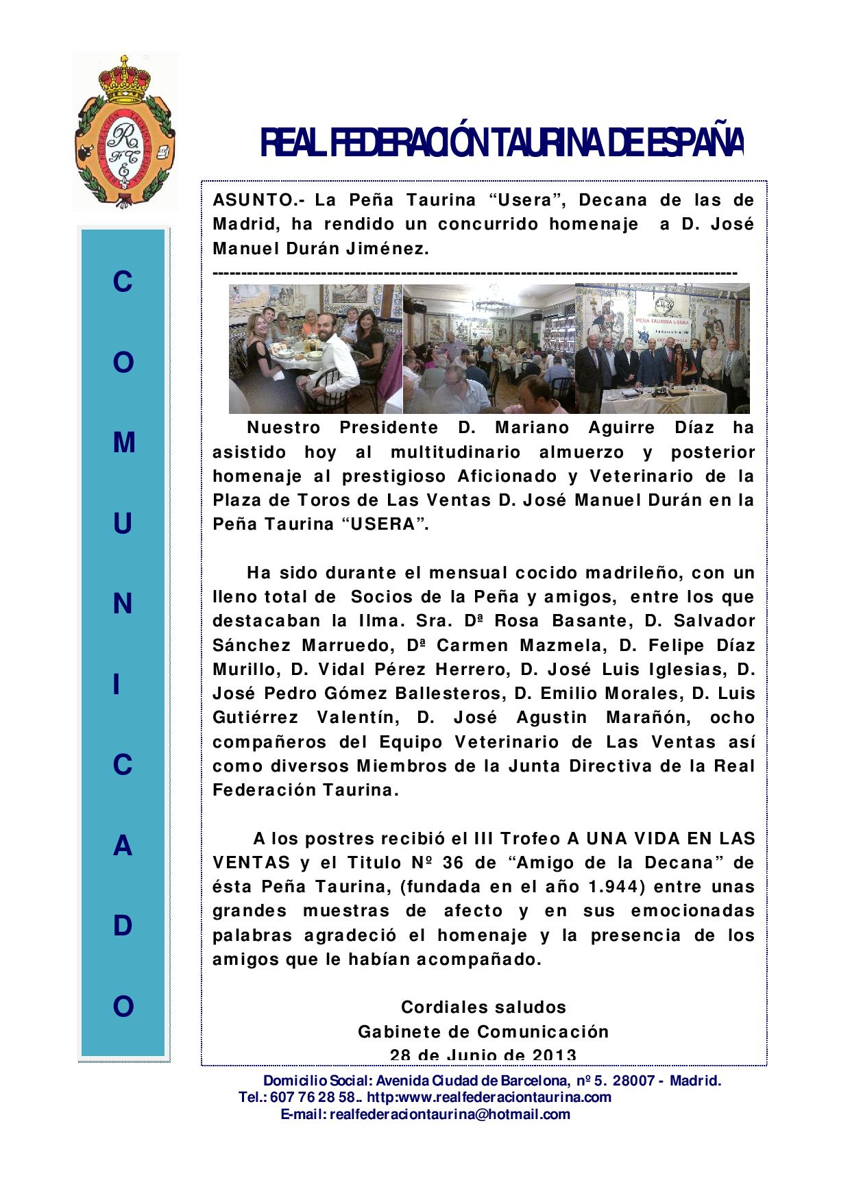 Al principio del acto tuvo lugar la entrega de una magnífica escultura en bronce y mármol de un toro a la Peña Taurina Usera, la recibió su presidente Don Félix Pinto Millán para que ocupe la mesa presidencial de estos homenajes, de manos de Don Salvador Sánchez – Marruedo, presidente de los Homenajes Escalera del Éxito, homenajeado y nombrado Amigo de la Decana el pasado 31 de mayo, obsequio de la empresa Teletrofeo.