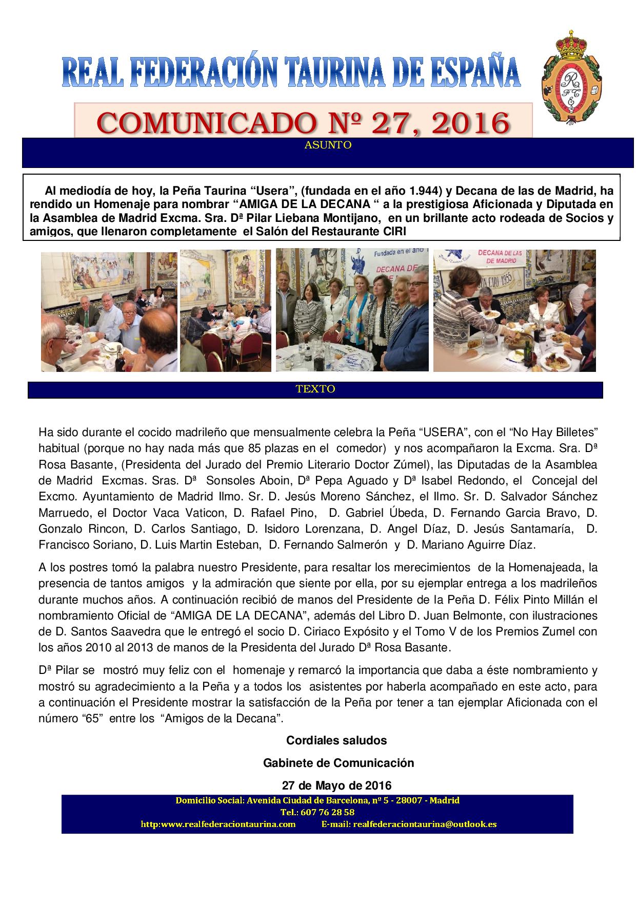 Peña Taurina Usera nombra `Amiga de la Decana´ a la Excma. Sra. Dª Pilar Liébana Montijano