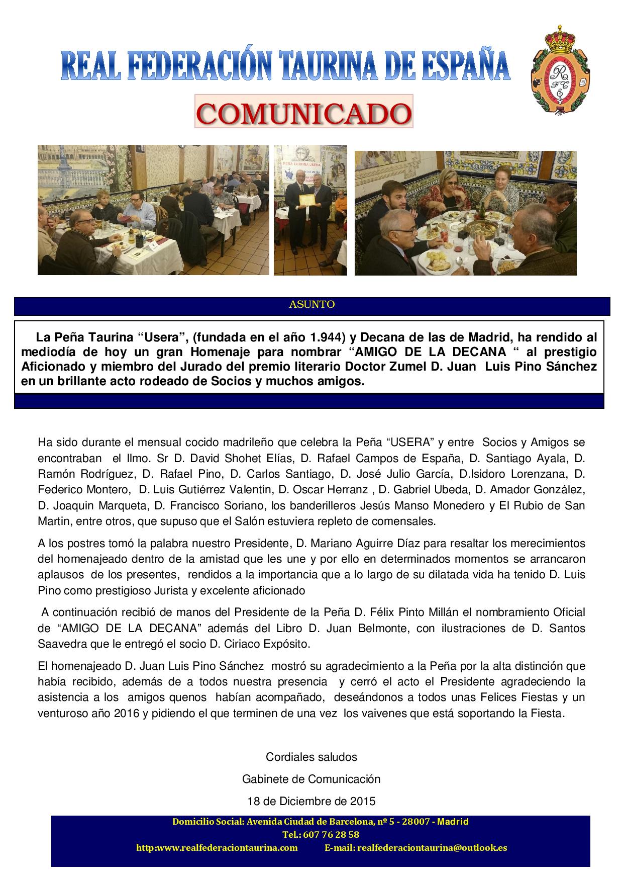 Peña Taurina `Usera´ rindió homenaje a Don Juan Luis Pino Sánchez