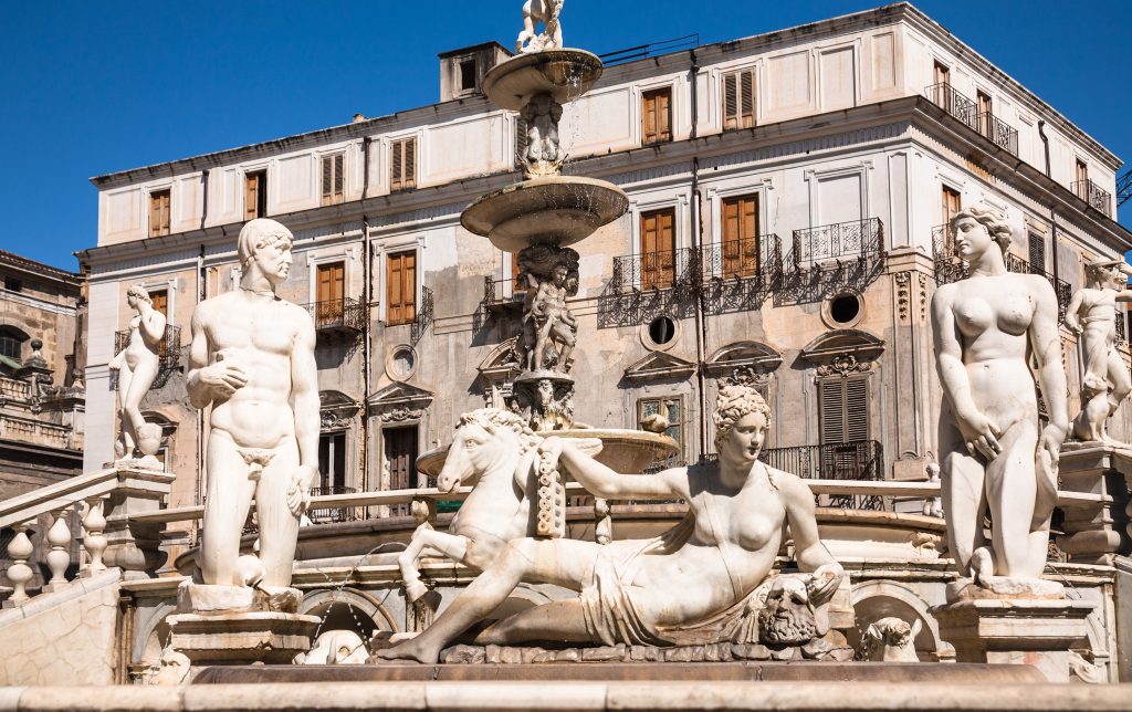 La Fontana Pretoria, con la plaza del mismo nombre en la que se encuentra, es uno de los lugares más fotografiado de la capital siciliana. Se trata de una fuente renacentista en principio destinada al jardín privado de una mansión señorial de Florencia. Su escenario representa el mundo mitológico de la antigüedad, con dioses, ninfas y nereidas mostrando sus cuerpos desnudos. La fuente de gran tamaño, ocupa el centro de la Piazza Pretoria y se eleva hasta unos trece metros sobre el nivel de la plaza. Una curiosidad es que se puede acceder al interior de la fuente desde la escalera sur, situada frente al Palazzo delle Aquile. La fuente ha sido realizada enteramente en mármol blanco de Carrara y se desarrolla en dos niveles sobre una planta elíptica y en cada esquina hay una pila presididas por divinidades paganas acostadas. Detrás está la iglesia conventual de Santa Caterina d’Alessandria desde cuyas ventanas enrejadas las monjas de clausura podían ver las estatuas de la fuente, lo que en su época escandalizó a la ciudadanía.