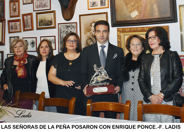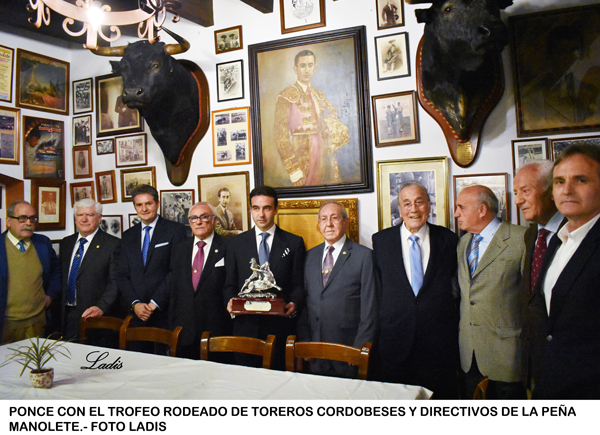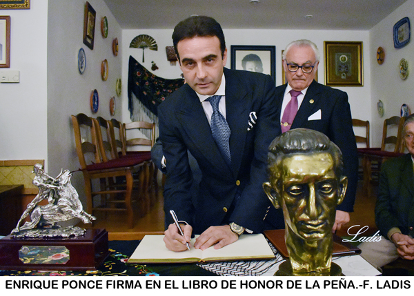 El matador de toros Enrique Ponce recogió, en la peña Manolete, el trofeo Mithra que esta entidad pone en juego en la feria de mayo para premiar la labor más completa realizada por los matadores de toros y al que el torero valenciano se hizo acreedor después de su soberbia actuación el día 27 de mayo de 2017. Esa tarde Ponce logró tres orejas y salió por la puerta de Los Califas.