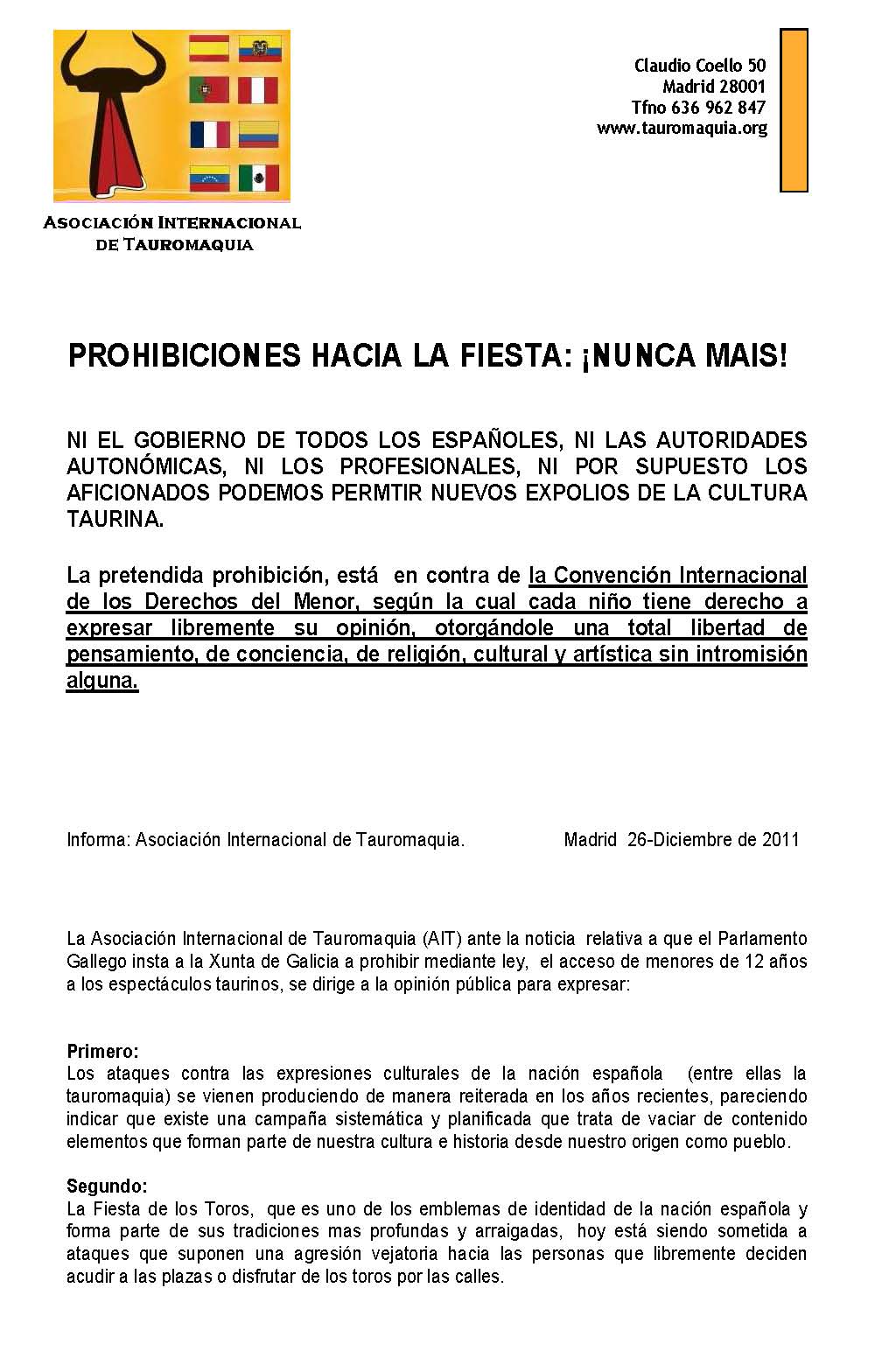 Posicionamiento de la AIT, frente a la pretendida prohibición de acceso de los menores a las corridas de toros en Galicia