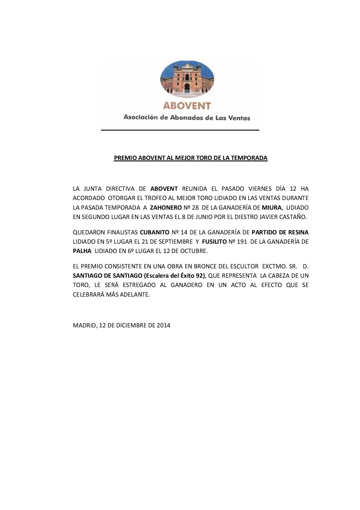 Premio ABOVENT al mejor toro de la temporada en Las Ventas