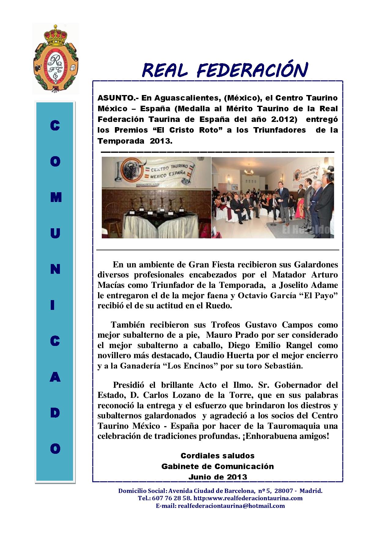 Premios Cristo Roto del Centro Taurino Mexico – España de Aguascalientes (México)