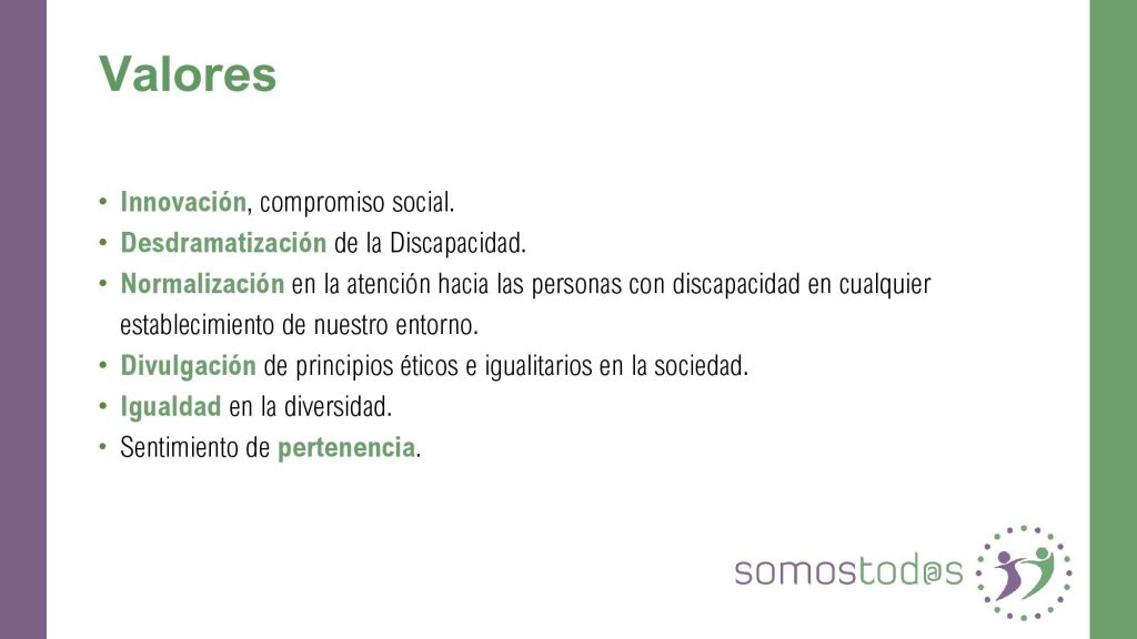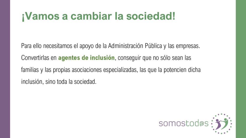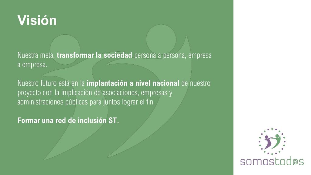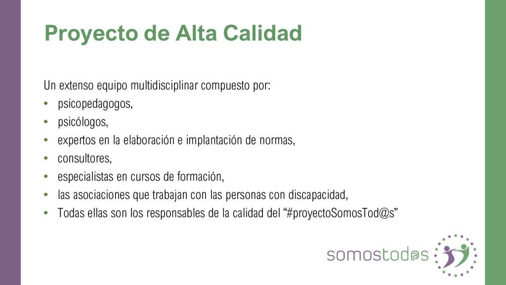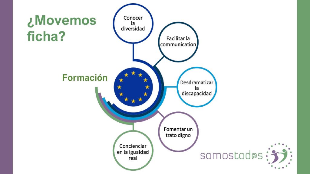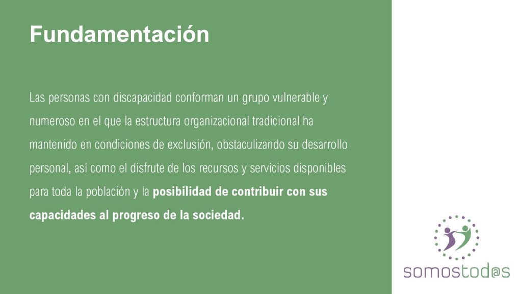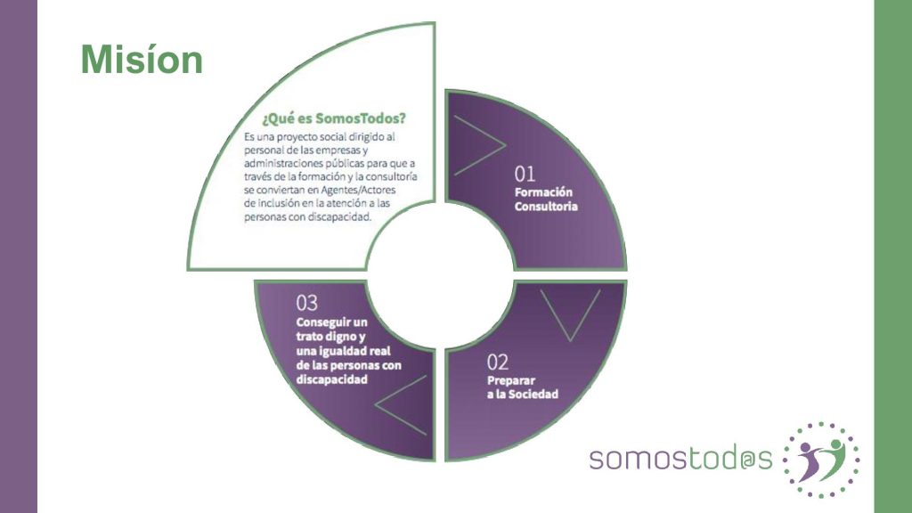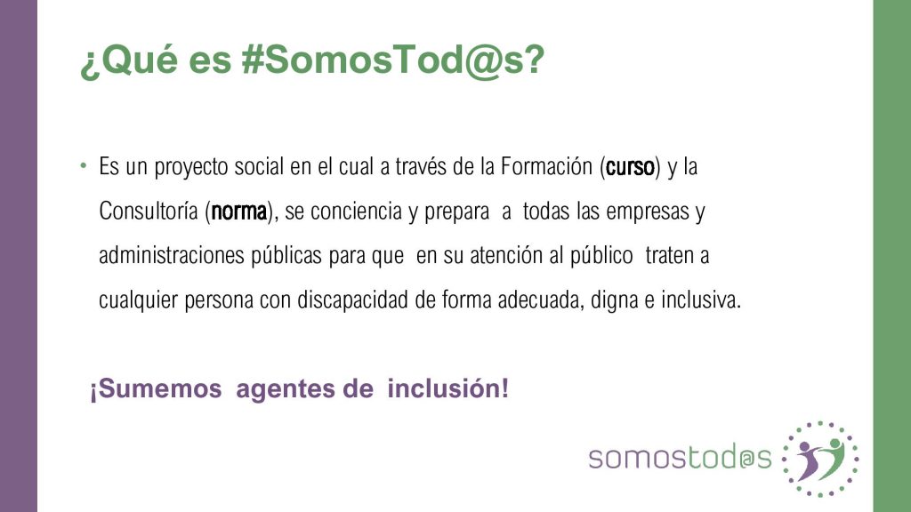 SomosTod@s es un proyecto de INCLUSIÓN en el que el fin, es formar a empresas y trabajadores para de forma adecuada, saber atender a las personas con discapacidad de cualquier tipo, así como crear espacios de confianza para las mismas,
