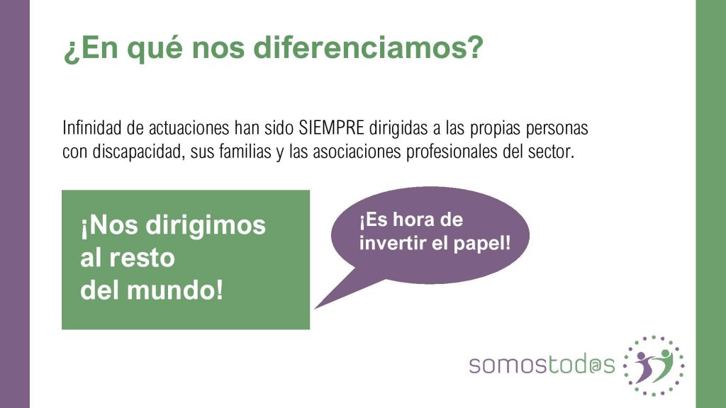 En un proyecto UNICO ya que hasta ahora, todo lo que se ha hecho en el mundo de la discapacidad (legislación, convenciones, subvenciones…etc) ha sido dirigido a estas mismas personas con discapacidad, las asociaciones que trabajan con ellas o a los profesionales del sector, pero ¿Y el resto del mundo? ¿Quién lo prepara para que haya una inclusión total?