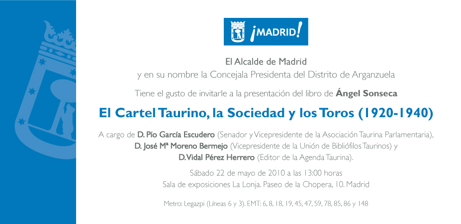La pasión de Doña Dolores -la popular y querida Lola, quien más votos aporta a su partido en las municipales de Madrid- por la tauromaquia, le ha granjeado la admiración y afecto en la capital de España. En esta ocasión se trata de la presentación de una gran obra, cuyo autor es nuestro socio Ángel Sonseca. El libro titulado «El Cartel taurino, la Sociedad y los Toros» (1920-1940), constituyen un hito en la recopilación de carteles taurinos históricos. Es la segunda parte del que ya se publicara anteriormente y que abarcaba una época anterior.