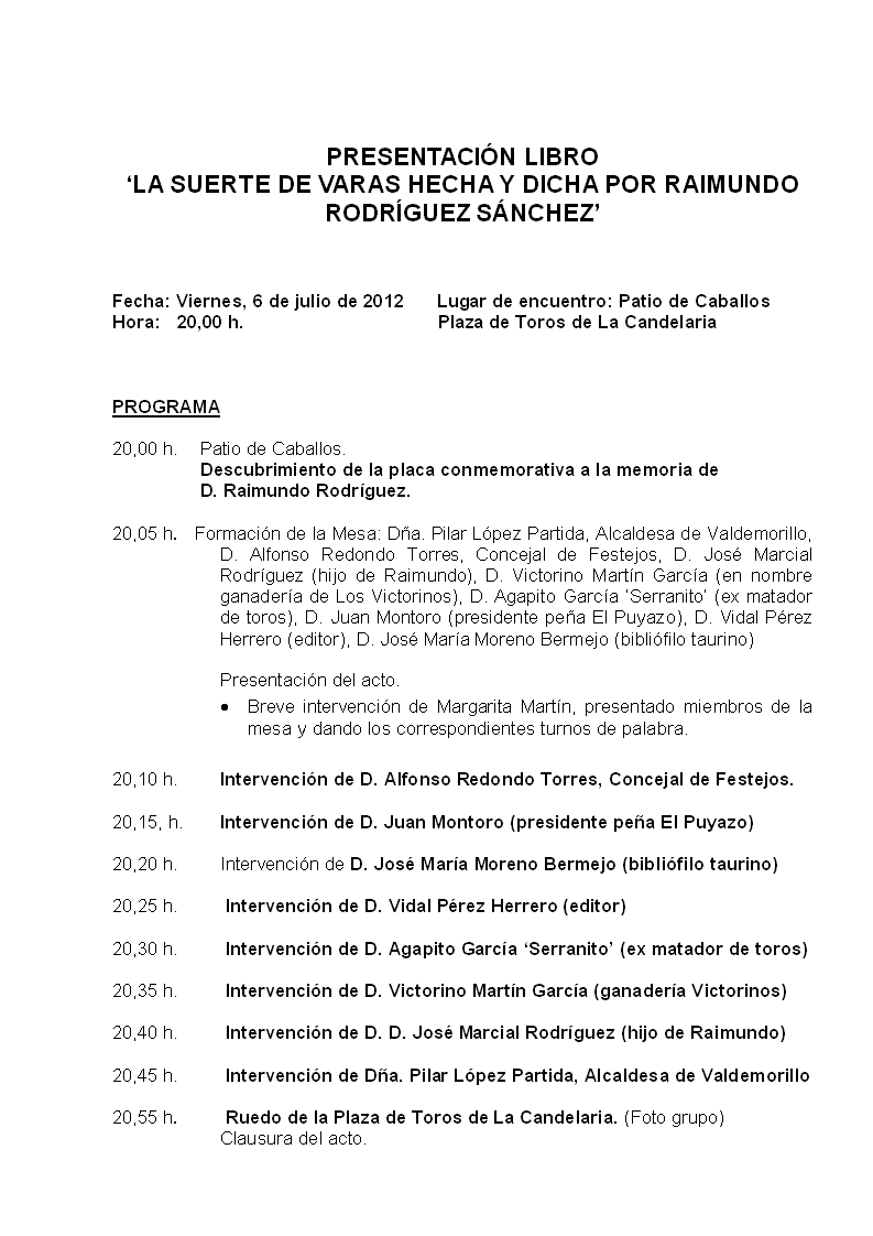 El que fuera eximio picador y excelente persona, D. Raimundo Rodríguez Sánchez, fallecido el pasado día 3 de abril del 2012, nos dejó un interesantísimo tratado sobre la Suerte de Varas, y una prolija y señera autobiografía sobre sus actuaciones profesionales. Su pueblo de adopción, Valdemorillo, lo recordará el próximo día 6 de julio en un sentido homenaje a celebrar en el patio de caballos de su plaza de toros. La convocatoria del acto, en el que se presentará el citado libro y se descubrirá un azulejo para el recuerdo imperecedero del gran picador, dice así: