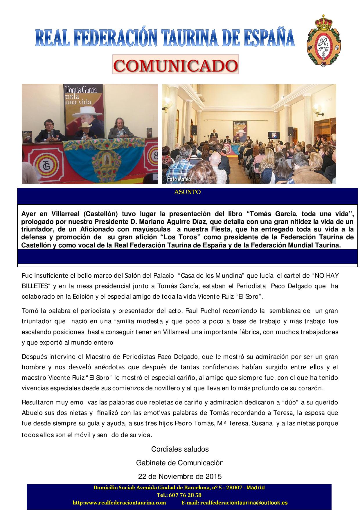 Presentación del Libro `TOMAS GARCIA, TODA UNA VIDA´ en Villarreal (Castellón)