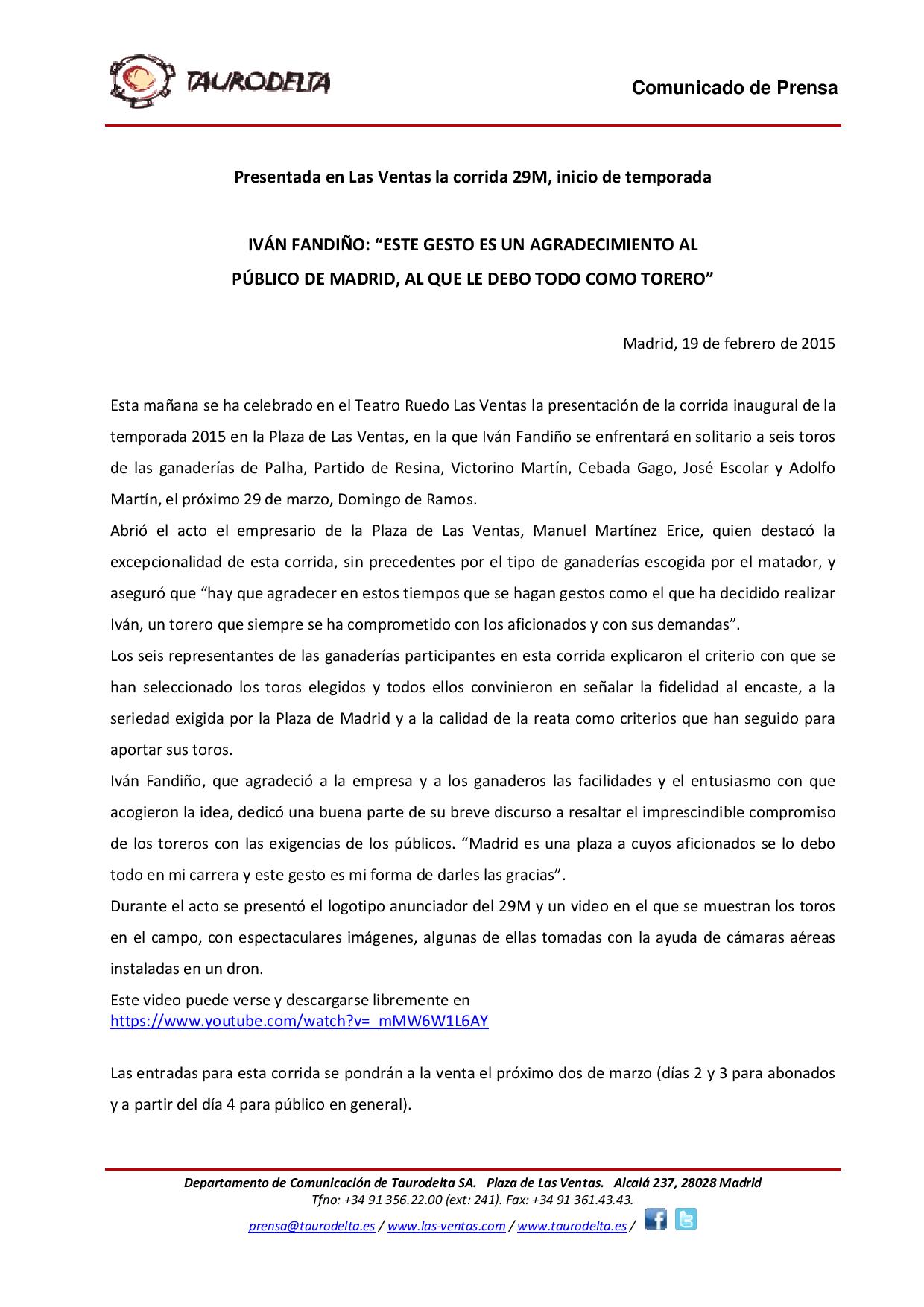 Presentada en Las Ventas la corrida 29M, inicio de temporada