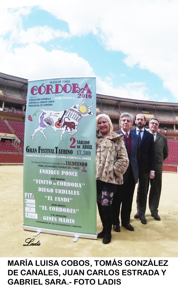 La presidenta de la Asociación Provincial de la Lucha Contra el Cáncer, María Luisa Cobos, dijo «sentirse muy orgullosa del cartel de este año, que llega a su XXII edición, dibujado por una niña de catorce años ingresada en la sección de oncología del hospital Reina Sofía en tan solo veinticinco minutos y que ha querido plasmar todo lo que es Córdoba. Es un cartel moderno, alegre y diferente». El festival de este año, fechado para el día 2 de abril a las cinco y media de la tarde, lo torearan los matadores de toros Enrique Ponce, «Finito de Córdoba», Diego Urdiales, «El Fandi», Julio Benítez «El Cordobés» y el novillero Ginés Marín, lidiando reses de Zalduendo. Al acto de presentación ha asistido, también, Juan Carlos Estrada, en nombre de la empresa FIT que rige los destinos de Los Califas. En su breve intervención dijo que «para la empresa, después de un año en Córdoba, era un reto especial la organización de este festival». Agradeció a los toreros su participación en el mismo y dejó de manifiesto que «han sido ellos los que se han ofrecido a torear el festival. El detalle de que la autora del cartel sea una niña es una manera de decir que esto lo construimos entre todos los cordobeses, ya que el festival es uno de los grandes ingresos de la Asociación». Además recalcó que «Córdoba es la única plaza de primera de España que lleva XXII años organizando el tradicional festival del cáncer». Igualmente apuntó que «el sector taurino se fortalece si vamos todos juntos». Por su parte, Tomás González de Canales, presidente de la Sociedad Propietaria de Los Califas, felicitó a la empresa y a la AECC por haber cerrado un cartel de tanta categoría y dejó claro que «siempre podrán contar con la propiedad ya que en los contratos exigen a las empresas que deben organizar y ayudar cada año a la Asociación».