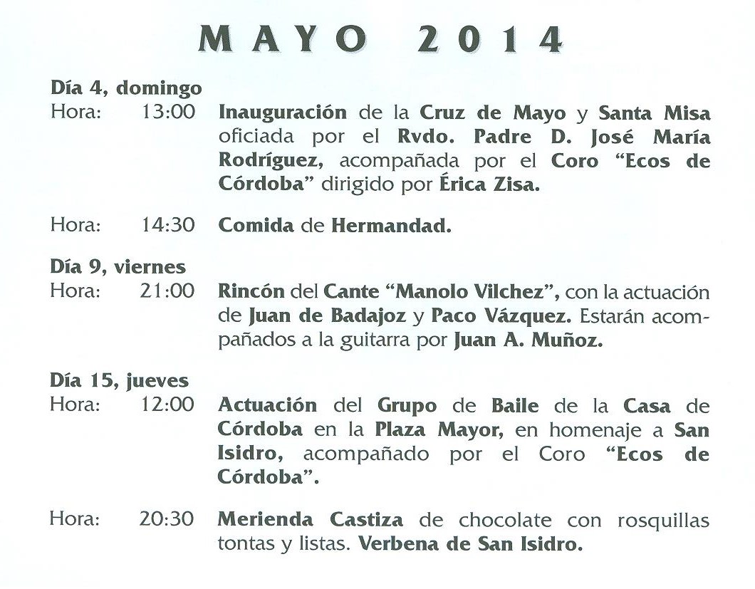 Programa de Actos de la Casa de Córdoba en Madrid. Asociación andaluza -Mayo 2014