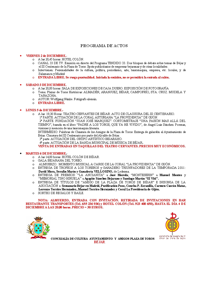 Programa de Jornadas Culturales Taurinas, Clausura III Centenario y Gala Bejarana del Toreo 2011