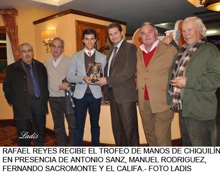 El joven novillero sin caballos cordobés Rafael Reyes ha sido distinguido por la Tertulia Taurina La Montera como triunfador de la temporada 2012. En nombre de la tertulia, el trofeo se lo entregó el director de la Escuela Taurina de Córdoba, de la que es alumno, Rafael González «Chiquilín» en un acto celebrado en el salón La Capea del Hotel El Pilar en la localidad de La Carlota. Testigos de excepción el presidente de la Federación Taurina de Córdoba Antonio Sanz Llergo, los matadores de toros Manuel Rodriguez Requena y Fernando Sacromonte y el novillero Juan Antonio García «El Califa», asi como gran cantidad de aficionados pertenecientes a la Peña Cultural Taurina Carloteña y al Rincón Taurino de Lázaro.
