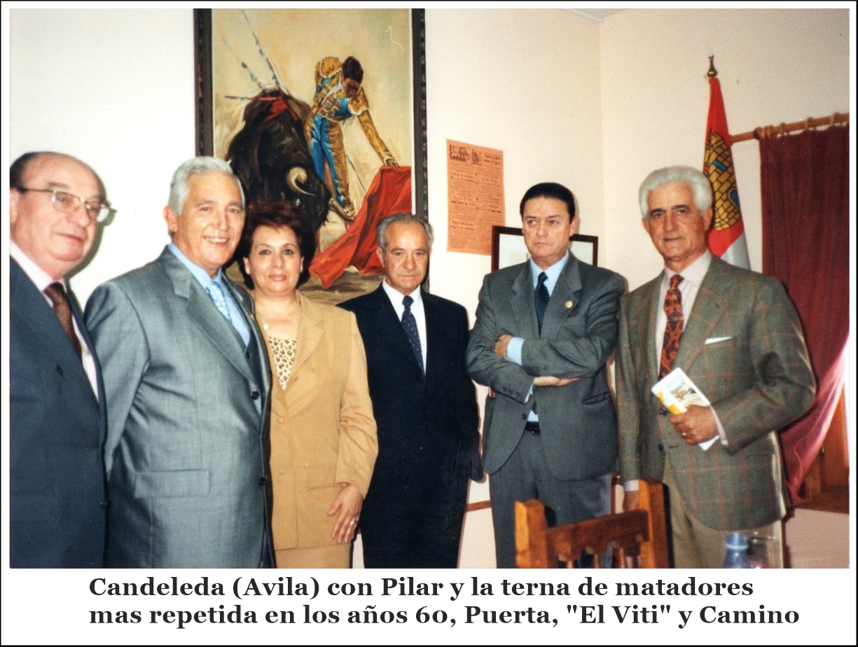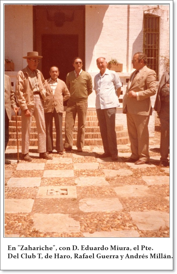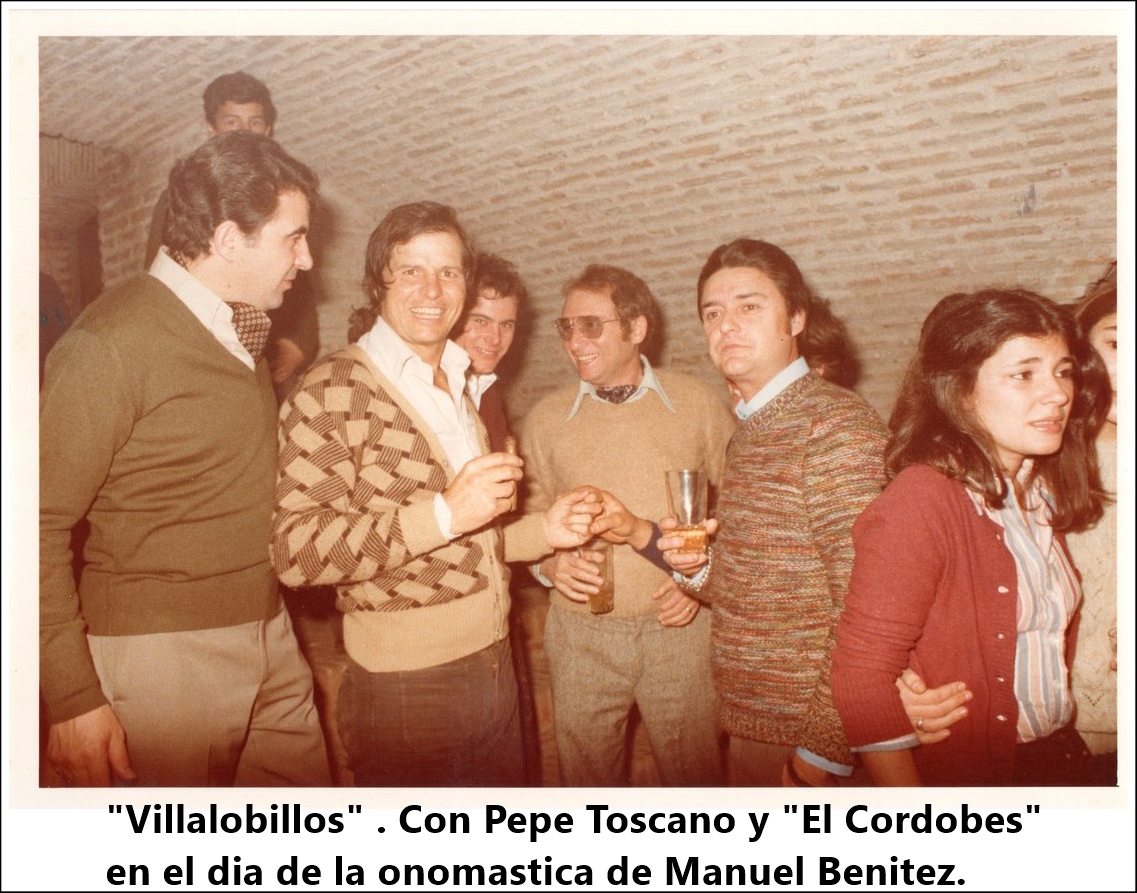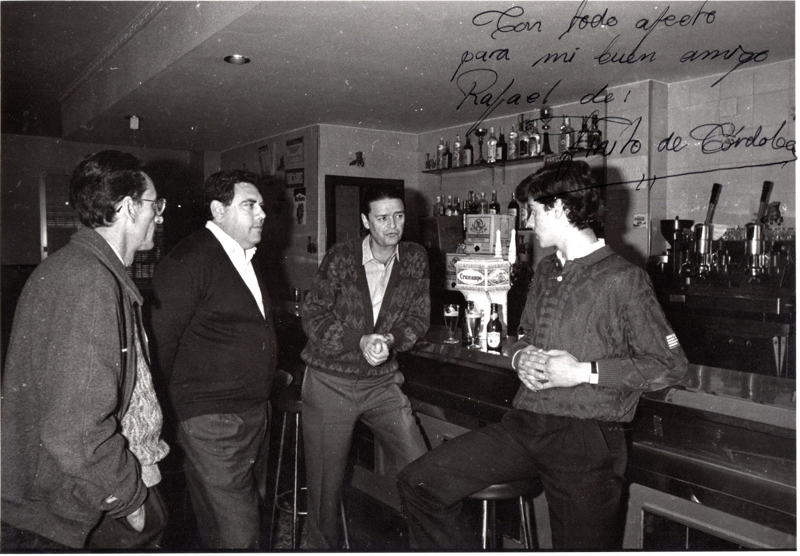 R Castellanos, F Toscano y Rafael Sánchez, notificándole a «Finito de Córdoba» la creación de la Peña Taurina en Bodegas Guzmán de calle judíos