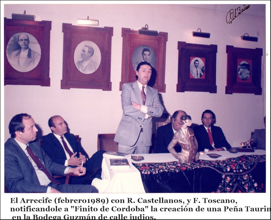 R Castellanos, F Toscano y Rafael Sánchez, notificándole a «Finito de Córdoba» la creación de la Peña Taurina en Bodegas Guzmán de calle judíos
