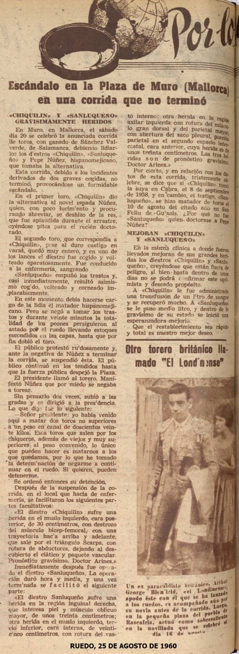 Las fotos que acompañan a estas líneas, se refieren a un hecho que escuché contar a uno de sus protagonistas, Alfonso González Chiquilín», tío del actual matador de toros, respecto a una corrida celebrada en agosto de 1960 en la plaza de la población de Muro, en Mallorca, con toros de Valverde, de Salamanca, para Alfonso González «Chiquilín», «Sanluqueño» y Pepe Núñez, que tomaría la alternativa. En realidad, esto sería lo único que vería el público, porque el segundo Valverde, «Cubetero», infligió una tremenda cornada en el muslo a «Chiquilín», que cuando estaba siendo atendido en la rudimentaria enfermería, escuchó un grito del público e inmediatamente después vio entrar en la enfermería a «Sanluqueño», que llevaba… tres cornadas nada mas: en la ingle, en el muslo y en la axila. El pronóstico fue de «gravísimo», igual que el de «Chiquilín», que sufrió además una fractura de fémur.