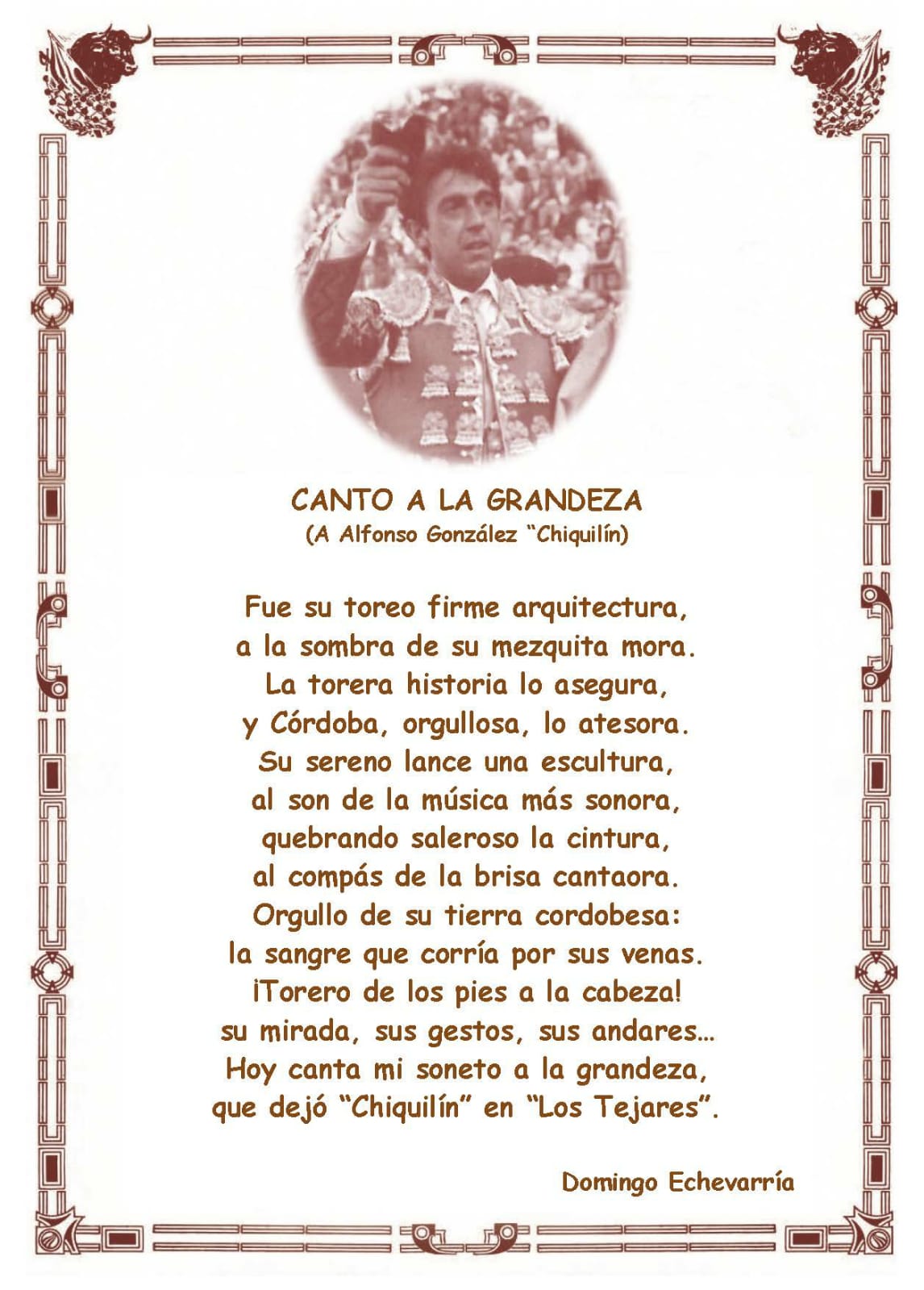 Domingo es ingeniero, profesor, escritor y poeta, vicepresidente de la Tertulia El Castoreño. Tiene las aficiones de caballista y tocaor de guitarra, y fue, además, amigo hasta el final de Alfonso «Chiquilín». De ahí que nos haya remitido la crónica del festejo en el que «Chiquilín» resultó gravísimamente herido y la versión que el propio espada le dio del percance.