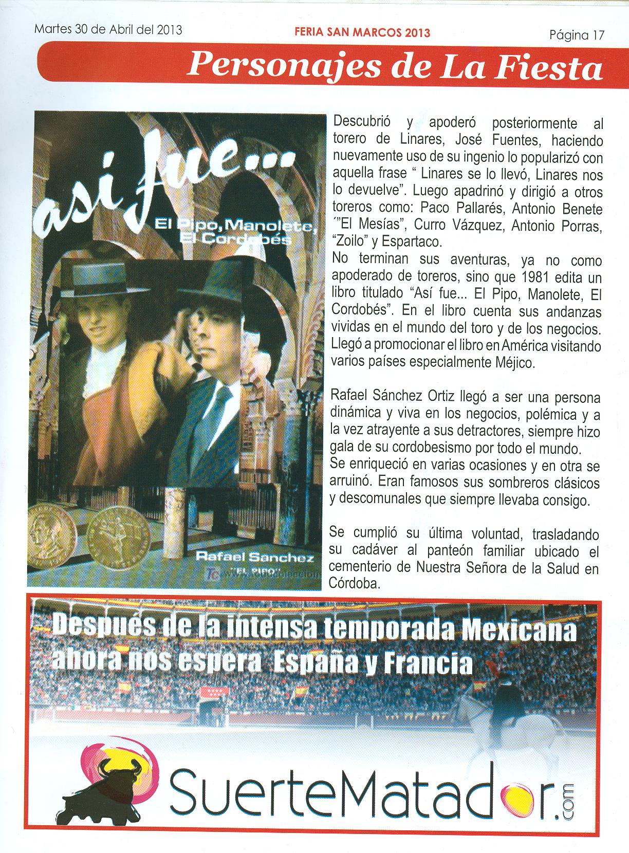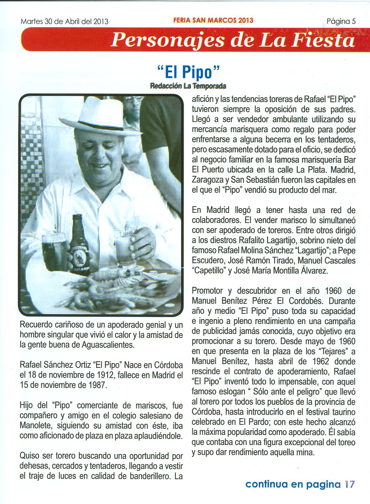 Nuestra querida amiga Muriel Feiner Friedman, Periodista –  Escritora- Fotógrafa  y poseedora desde el año 2010 en su edición nº XX del  galardón  “Romántico del toreo” – Rafael Sánchez “Pipo”, por su aportación y entrega a la Fiesta, hace unos días de regreso de Aguascalientes, México, nos trajo el programa que edita la “Temporada taurina MR” en su edición Aguascalientes, AGS., de la Plaza de Toros Monumental Feria de San Marcos 2013. En sus páginas “Personajes de la Fiesta” viene dedicado a Don Rafael Sánchez “El Pipo”, padre de nuestro Presidente Salvador Sánchez – Marruedo”. Empieza diciendo: Recuerdo cariñoso de un apoderado genial y un hombre singular que vivió el calor y la amistad de la gente buena de Aguascalientes.
