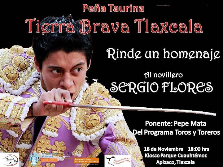 La Peña Taurina Tlaxcala Tierra Brava, que es presidida por la inagotable, entusiasta y talentosa, Eva Espinosa, nuevamente ponen el ejemplo de amor por y para la Fiesta, al rendir este 18 de noviembre, en Apizaco, Tlaxcala, más que merecido homenaje, al extraordinario novillero tlaxcalteca, Sergio Flores, quien ha demostrado con base en sólidos argumentos ser el mejor novillero del mundo.