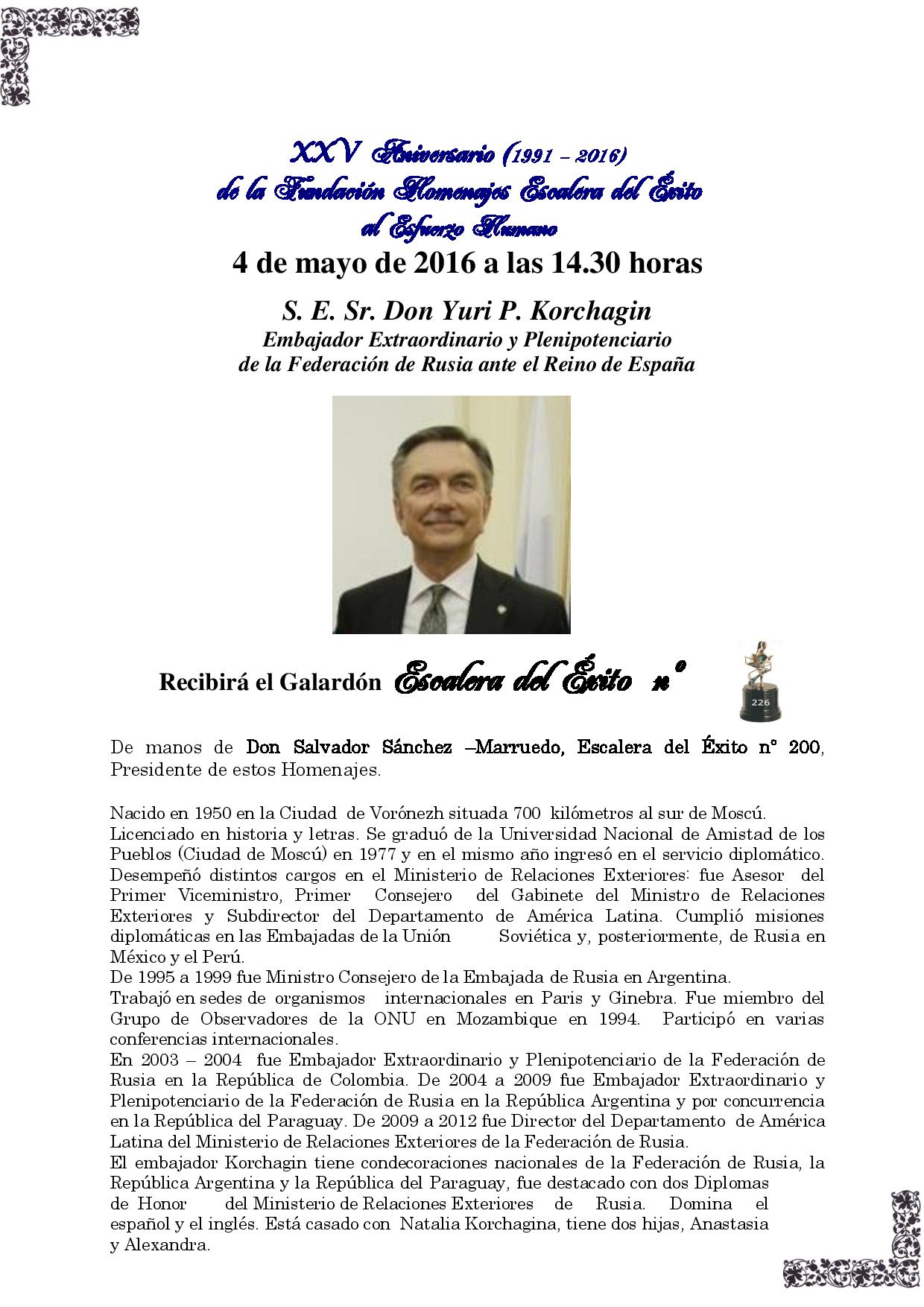S. E. Sr. Don Yuri P. Korchagin recibirá la Escalera del Éxito nº 226 el próximo 4 de mayo