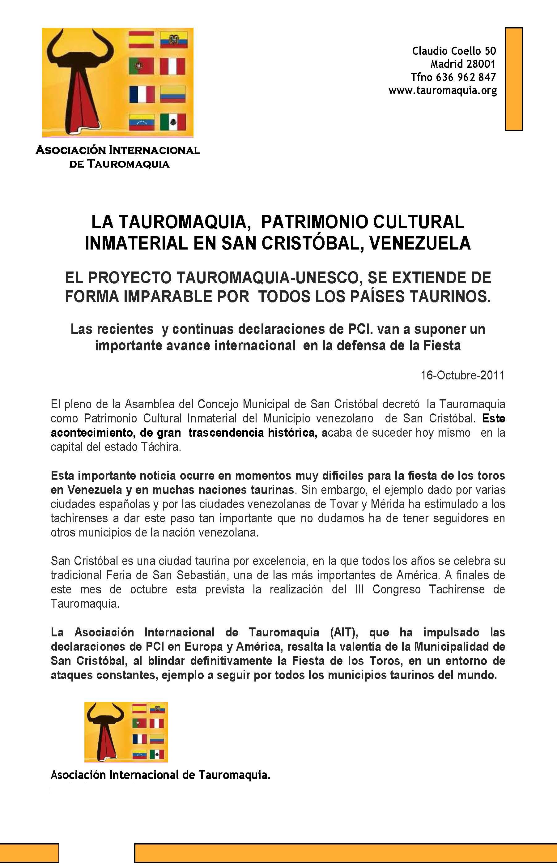 San Cristóbal, Venezuela, declara PCI la Fiesta de los Toros