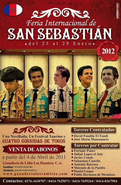 Viernes 27.01.2012 – Encierro de “Los Ramírez” para el venezolano Leonardo Benítez, el español David Fandila “El Fandi”, el francés Sebastián Castella y el Rejoneador venezolano José Luis Rodríguez.