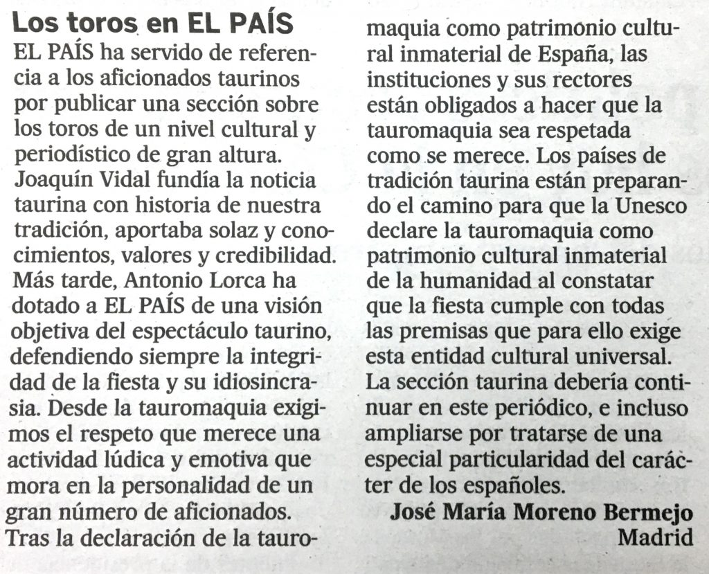 Con motivo de los comentarios oídos sobre la fuerza que ciertos anti taurinos están haciendo para que el diario “El País” suspenda la información taurina, dirigimos hace 4 fechas, al defensor del lector del citado periódico, nuestros argumentos legales, culturales y de necesaria libertad para exigir la continuidad de la citada información. La contestación del defensor fue rápida y categórica: “la intención del periódico es seguir con la información taurina, como hasta ahora”.
