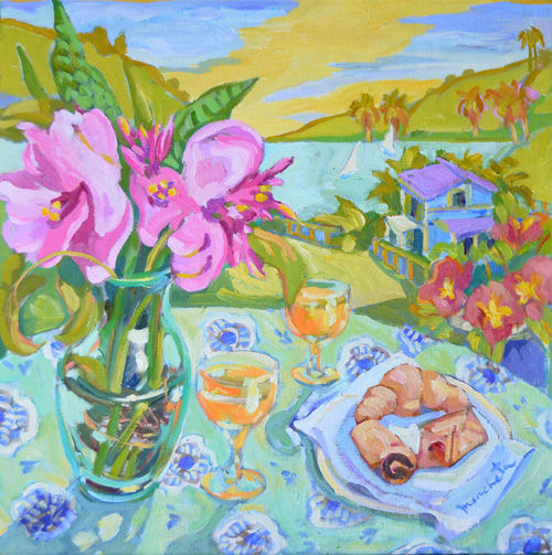 La artista valenciana con un desbordante colorido que rompe moldes y cánones, expresa con arrolladora fuerza, la visión de los paisajes que concibe, donde la forma, la luz y el color se integran armónicamente.