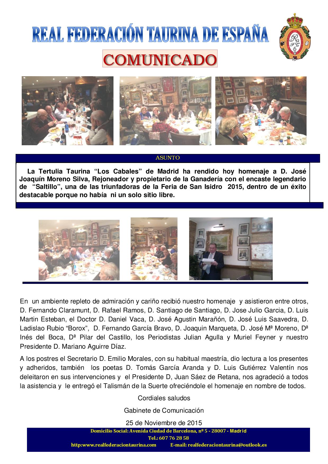 Tertulia Taurina `Los Cabales´ rindió un homenaje al Rejoneador y Ganadero José Joaquin Moreno Silva