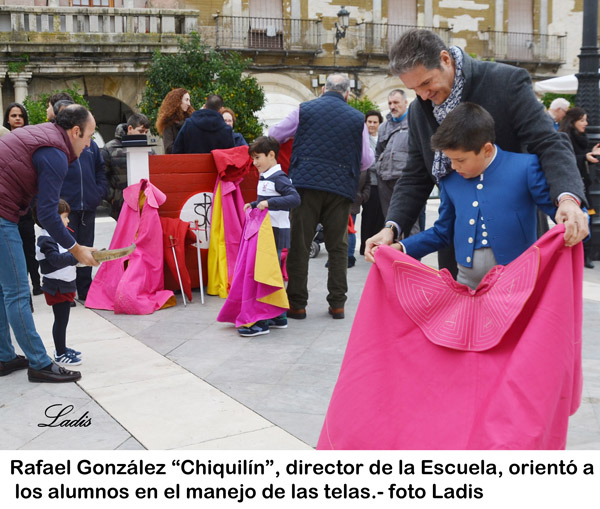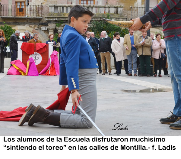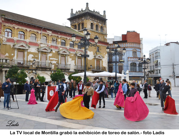 Capotes y muletas volvieron a ser protagonistas en la vía pública. Esta vez ha sido en la plaza de la Rosa de Montilla, ante el histórico Teatro Garnelo. Allí, organizado por la Asociación Cultural Taurina Peña Solano González de Montilla con la colaboración del Excmo. Ayuntamiento y de la Escuela Taurina del Círculo Taurino de Córdoba, se vivió una mañana de mucho calado taurino. Fueron doce los chavales que mostraron sus conocimientos a los numerosos montillanos que no quisieron perderse este colorista espectáculo que durante casi dos horas inundó de alegría esta zona del pueblo. Con la música de fondo de pasodobles taurinos, los alumnos fueron dibujando en el aire «memorables faenas» a toros imaginarios. Cada uno soñaba a su manera sintiéndose torero y sobre todo protagonista y blanco de las miradas de los asistentes.