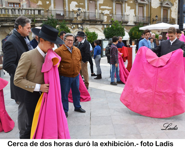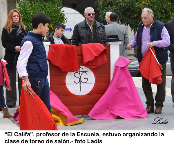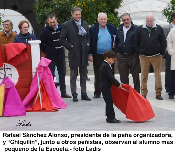 La demostración estuvo arropada, aparte de por numeroso público, por el presidente de la entidad organizadora Rafael Sánchez Alonso acompañado de su equipo directivo y miembros de la Peña y por parte de la Escuela apoyaron a los alumnos su director artístico Rafael González «Chiquilín» y el profesor Juan Antonio García «El Califa» que, como si se tratara de una clase más, asistían a los noveles y le corregían posiciones en el manejo de las telas.