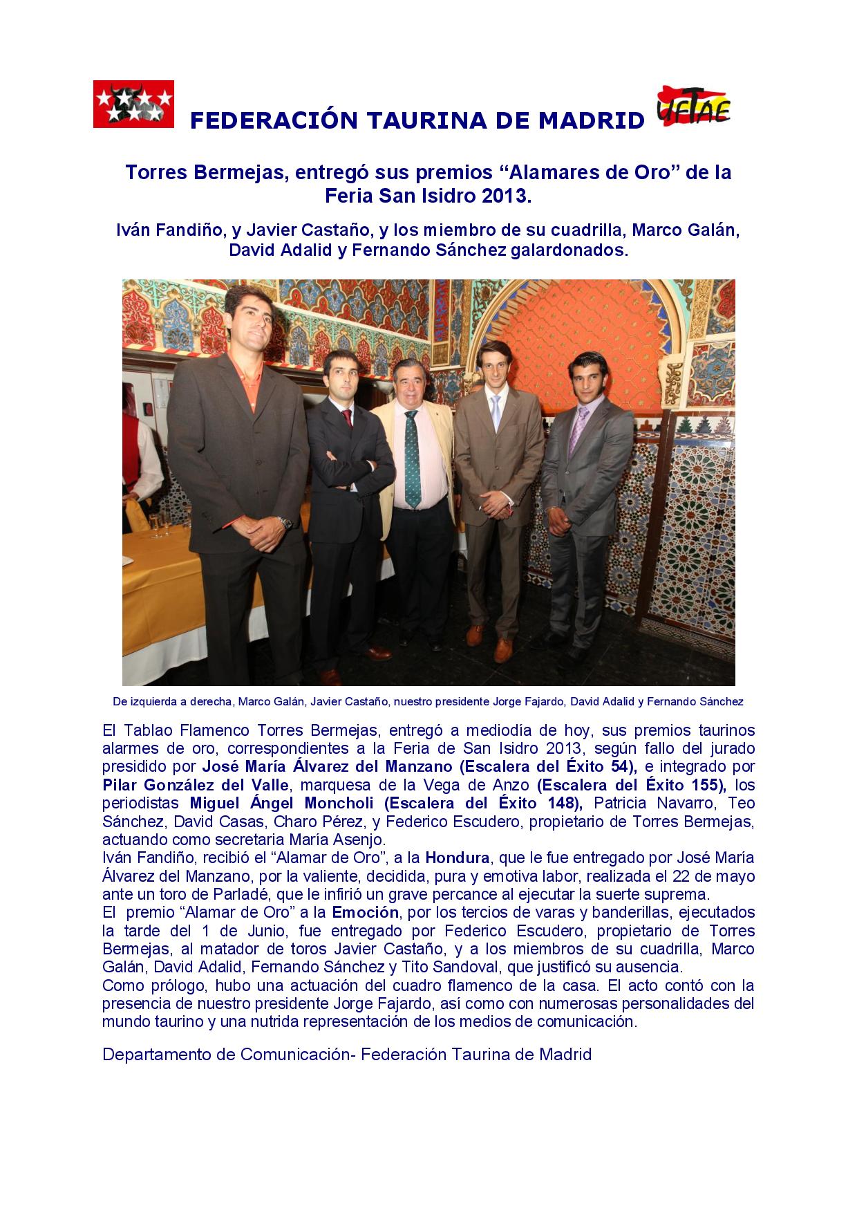 Torres Bermejas entregó sus premios Alamares de Oro de la Feria San Isidro 2013